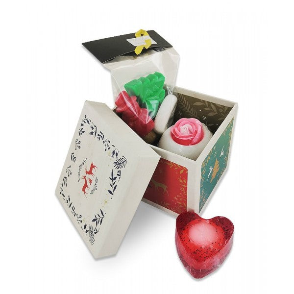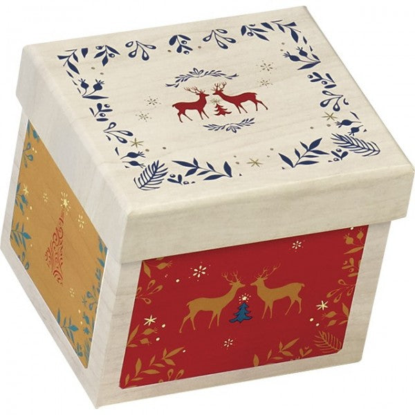 Cutii mici pătrate din carton cu decor de Sărbători Fericite.