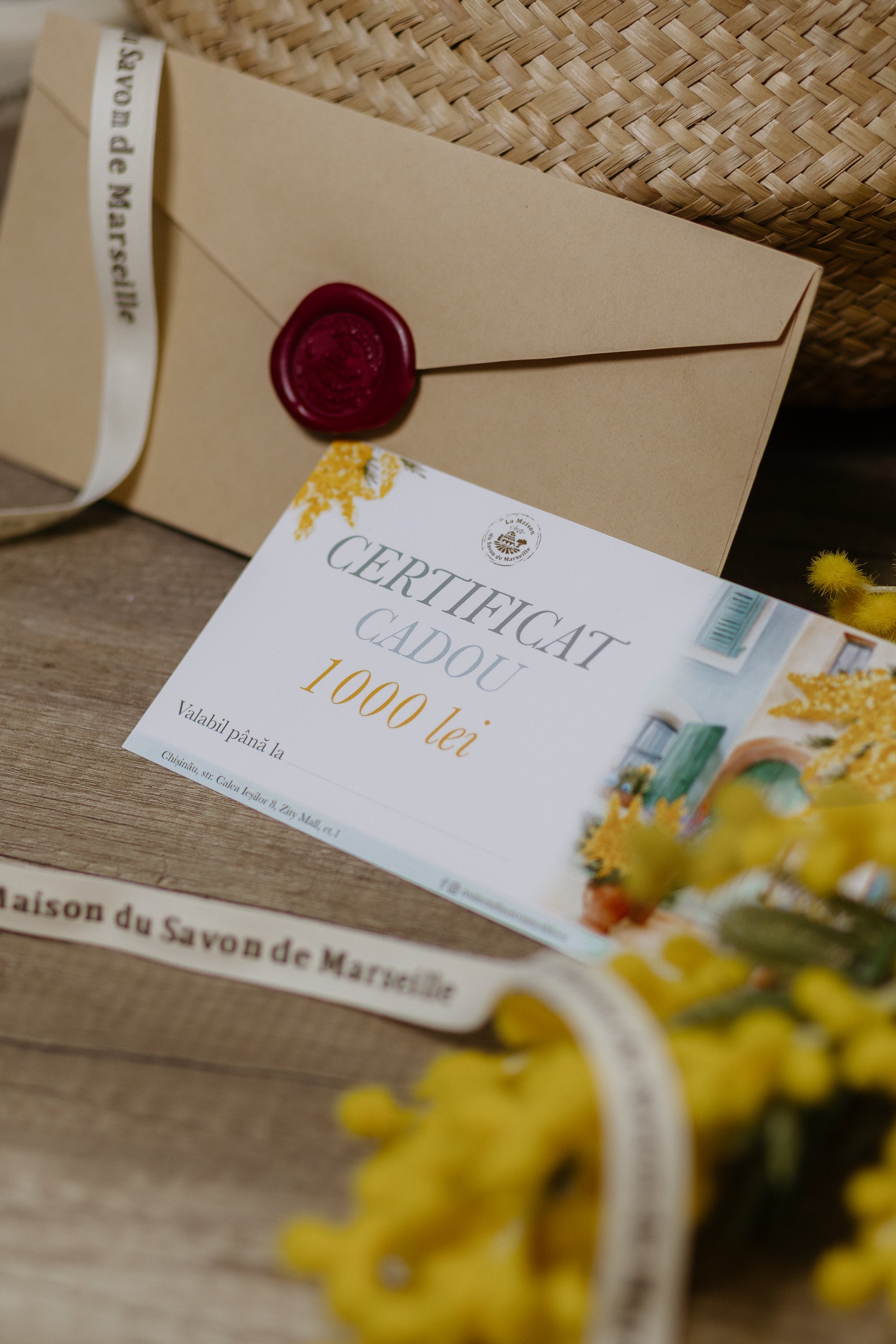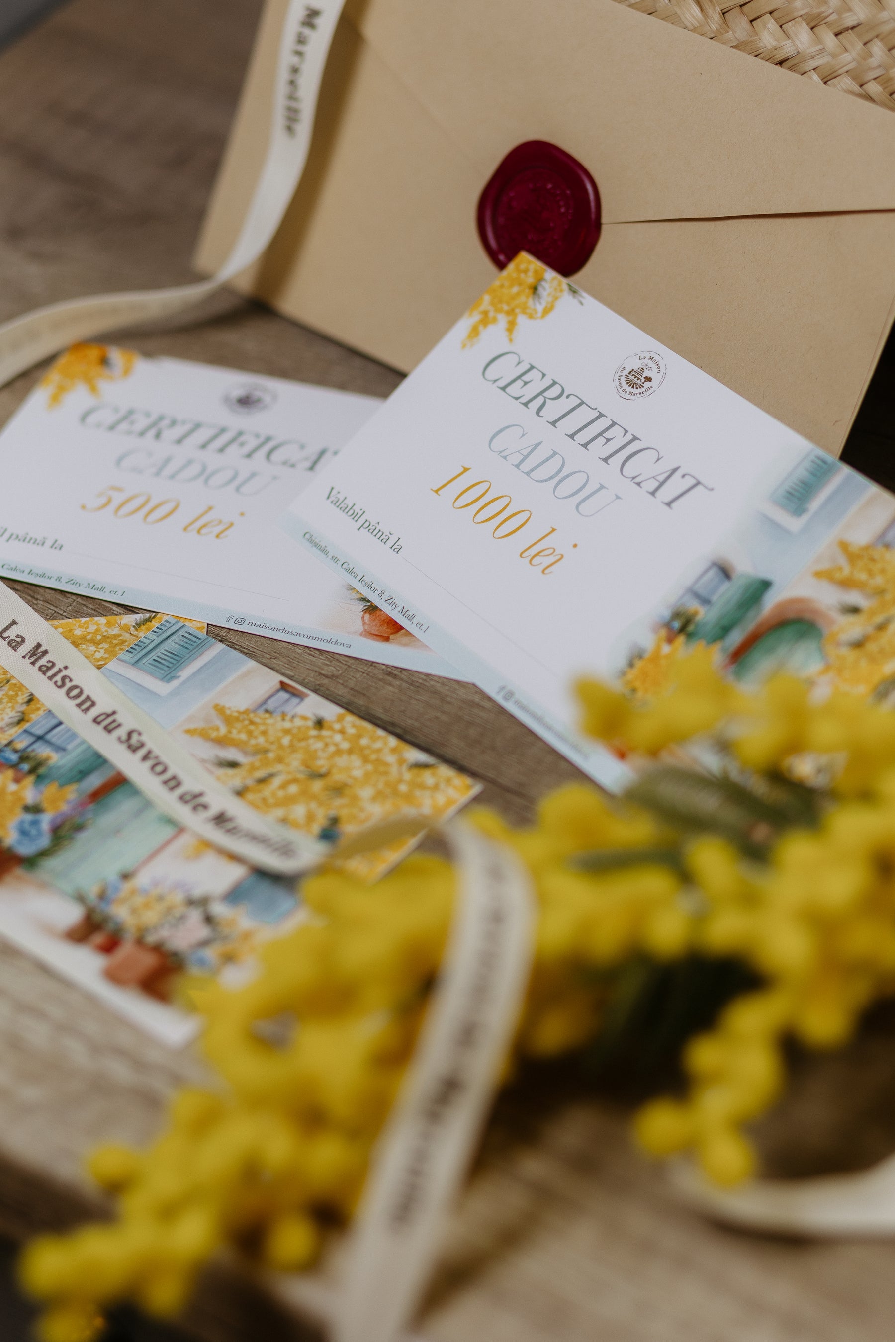 Îmbrăcate în Mimoză aurie, floarea emblematică a Provence-ului, certificatele cadou La Maison du Savon de Marseille sunt disponibile în magazinul nostru fizic și online.