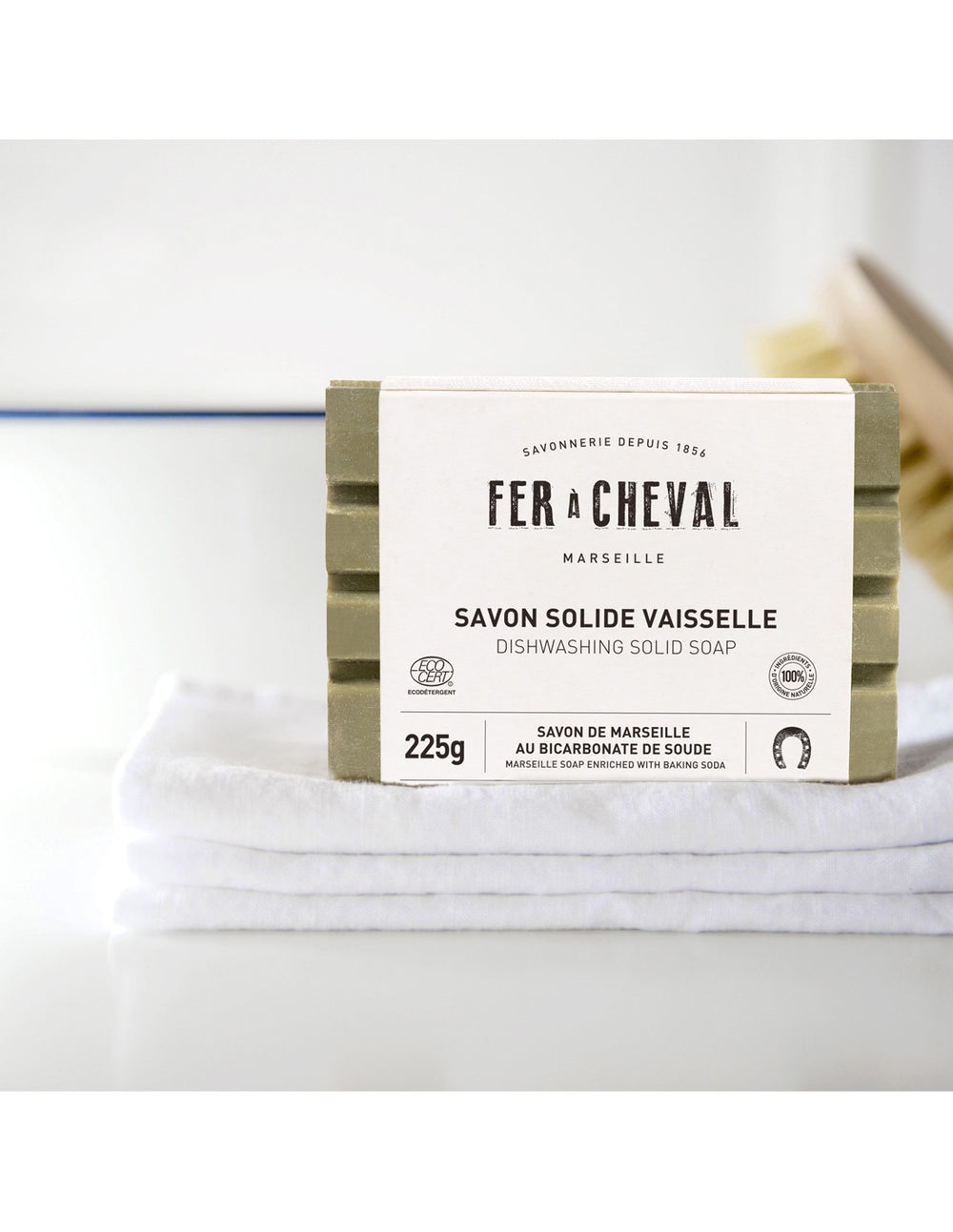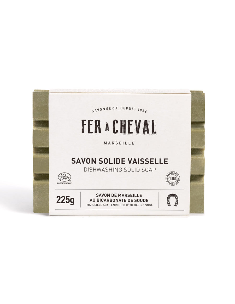 Fabrica de săpunuri Fer à Cheval este mândră să vă prezinte săpunul solid pentru vase. Pe bază de săpun de Marsilia și îmbogățit cu bicarbonat de sodiu, acesta vă reconectează cu bucătăria autentică!